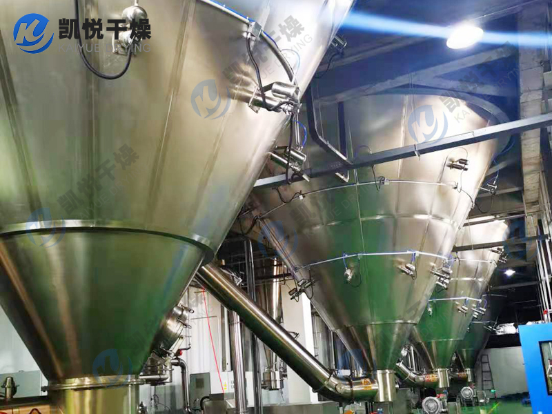 空气经空气过滤器后进入空气加热器,当空气加热器到给定的温度后以切线方向进入热风分配器,经热风分配器作用后的空气,均匀地、螺旋式地进入干燥室,同时料液由雾化器雾化为20~60um的雾滴,当雾滴与热空气接触后就迅速汽化干燥为粉末或颗粒产品。采用旋风风离器直接收集后经气力输送至效料仓,完成物料的冷却及输送,废气由风机排出口经水沫除尘器排出。