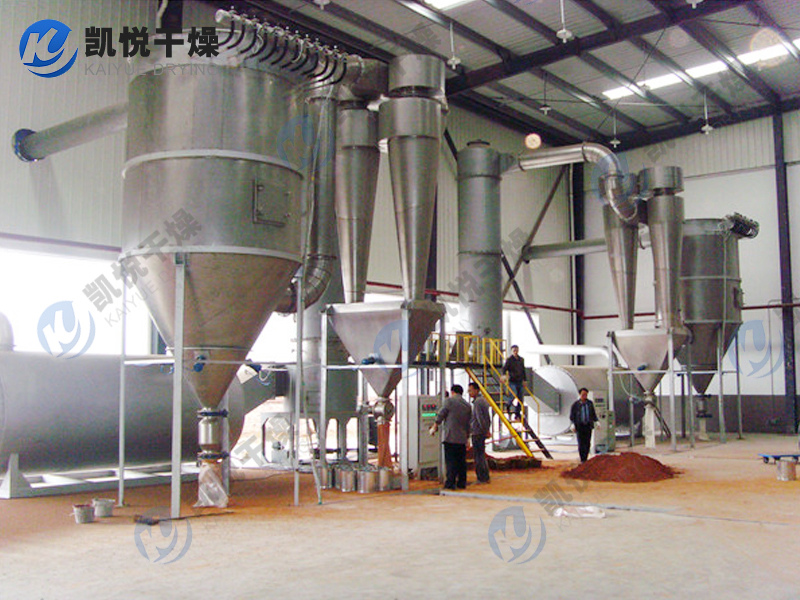 粒度分级:在干燥主机的上部设置环形挡板,此被称为闪蒸干燥机分级器。当物料运动经过该分级器时变会受到离心力的作用,呈现不同旋转半径螺旋上升的趋势。粒径较小的物料从分级器的内孔排出;颗粒较大的物料被留在干燥室内继续粉碎,待达到标准粒度从内孔排出。