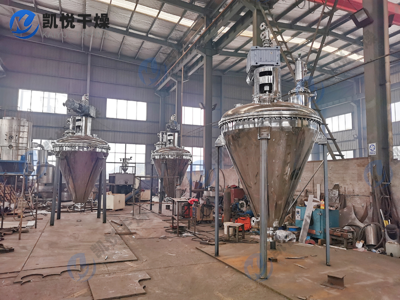 1、单锥真空干燥机工作过程为间歇批操作,湿物料进入料仓后,通过筒壁夹套和螺旋桨内部给热,使给热面积达到整个容器面积的140%,对物料进行升温干燥。并选择相应的锥型干燥混合器型号(工作容积)达到理想的干燥效果。采用上驱式结构的混合干燥机具有高效干燥、混合能力的同时,具有空间充裕,更便于使用者进行检修维护的特点。