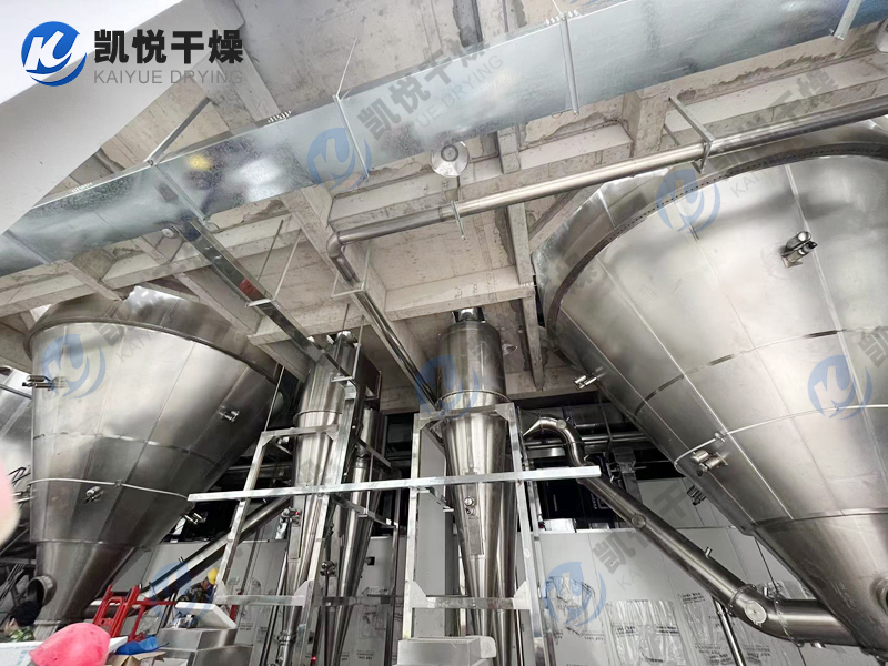 空气经空气过滤器后进入空气加热器,当空气加热器到给定的温度后以切线方向进入热风分配器,经热风分配器作用后的空气,均匀地、螺旋式地进入干燥室,同时料液由雾化器雾化为20~60um的雾滴,当雾滴与热空气接触后就迅速汽化干燥为粉末或颗粒产品。采用旋风风离器直接收集后经气力输送至效料仓,完成物料的冷却及输送,废气由风机排出口经水沫除尘器排出。